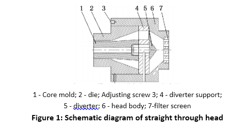 La testa è generalmente composta da corpo della testa, deviatore, supporto del deviatore, vite di regolazione, matrice centrale, labbro della matrice, ecc. i tipi ditesta di estrusione del tubosono generalmente suddivisi in tipo diritto, tipo ad angolo retto, tipo eccentrico, tipo a spirale e tipo a cestello. La testa passante è quella più comunemente utilizzata e la sua struttura è mostrata in Figura 1. La testa può essere divisa nelle seguenti tre parti: il corpo testa e il deviatore costituiscono la prima parte della testa, cioè la sezione preforma; La sezione di compressione del supporto deviatore, matrice e anima costituiscono la seconda parte della testa, ovvero la sezione di compressione; I tratti rettilinei della matrice e dell'anima costituiscono la terza parte della testa, ovvero la sezione di formatura.