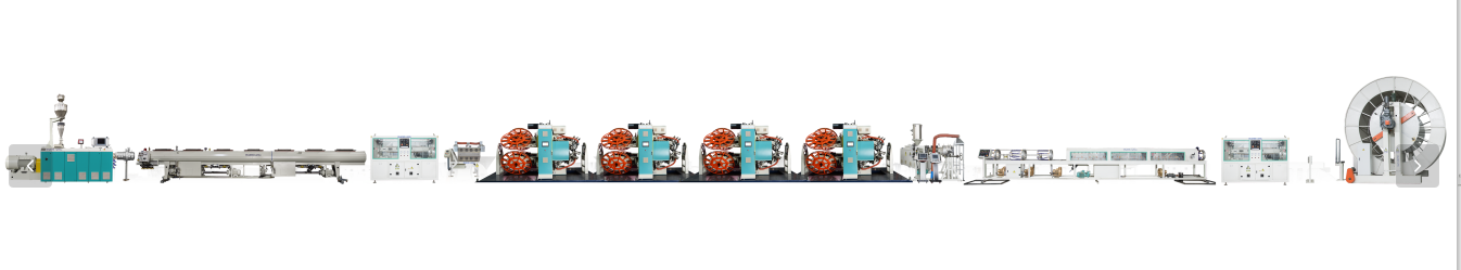 Linea di estrusione di tubi termoplastici rinforzati (RTP)., utilizzato appositamente per la produzione di tubi compositi flessibili rinforzati con filo termoplastico non metallico rinforzato, che ha introdotto la tecnologia più recente negli Stati Uniti. Il tipo G di fascia alta adotta gli standard UE e il tipo U di fascia alta in Nord America adotta gli standard nordamericani. Tutta la serie è configurata secondo il marchio GRAEWE FANGLI.