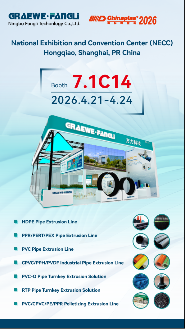 मराठी Benvenuti al nostro stand 7.1C14 al ChinaPlas 2026,Ningbo Fangli Technology Co., Ltd.(di seguito denominata "Fangli") è specializzata in ricerca e sviluppo, produzione e vendita diattrezzature per l'estrusione di plastica, nuove linee di produzione per la tutela dell'ambiente, macchine per la saldatura di tubi in plastica e macchine ausiliarie in plastica.
